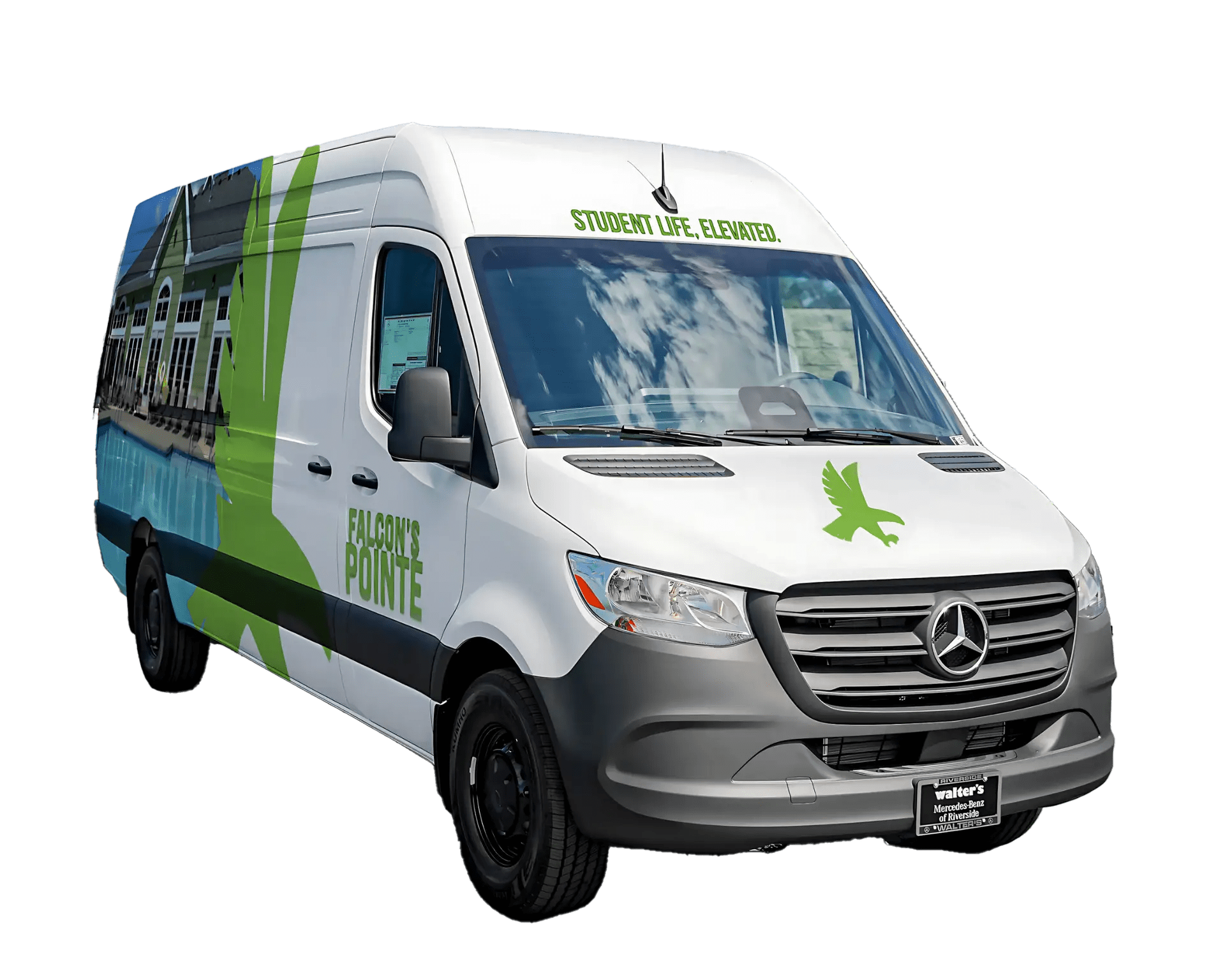 Falcons Pointe Apartments needed their shuttle to function as both transportation and a moving advertisement to attract students. The goal was a design that felt professional, modern, and consistent with the apartment brand.